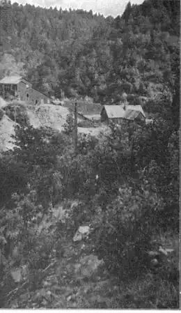 In 1893, five men are employed in the chlorination works. Fifty-six men and boys were employed underground, plus three in the mill. Miners' wages underground were $3 per day.[4]