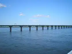 The Champlain Bridge (French: Pont Champlain) was a steel truss cantilever bridge with approach viaducts constructed of prestressed concrete beams supporting a prestressed concrete deck paved with asphalt. Opened in 1962, the bridge crossed the Saint Lawrence River, connecting the Island of Montreal to its South Shore suburbs.[3]