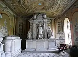 The mausoleum contains memorials to members of the Chandos family.[5] On the west wall is a sculptured monument to the 1st Duke which originally stood in the church. It was commissioned from Grinling Gibbons, although Pevsner is sceptical about the extent to which it was executed by Gibbons rather than his workshop. The Duke is shown in a wig dressed as a Roman citizen. This figure is flanked by plain pilasters outside which are the kneeling figures of two of his wives, Mary Lake and Cassandra Willoughby.