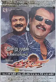 Chandramukhi (transl. Moon-faced lady) is a 2005 Indian Tamil-language psychological comedy horror film written and directed by P. Vasu. It is a remake of Vasu's Kannada film Apthamitra (2004) which itself was based on the Malayalam film Manichitrathazhu (1993). The film stars Rajinikanth, Prabhu and Jyothika along with an ensemble supporting cast, including Vadivelu, Nayanthara, Nassar and Sheela. It revolves around a woman who suffers from dissociative identity disorder that affects a family, and a psychiatrist who intends to solve the case while risking his life.