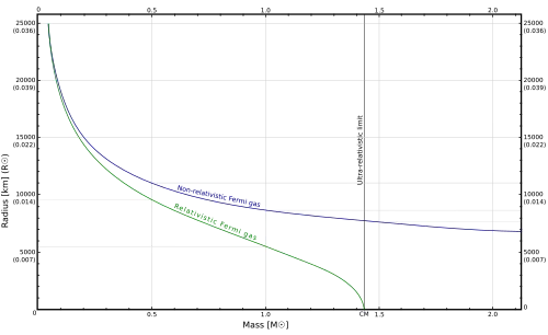 For a fully relativistic treatment, the equation of state used interpolates between the equations P = K1ρ5/3 for small ρ and P = K2ρ4/3 for large ρ. When this is done, the model radius still decreases with mass, but becomes zero at Mlimit. This is the Chandrasekhar limit.[10] The curves of radius against mass for the non-relativistic and relativistic models are shown in the graph. They are colored blue and green, respectively. μe has been set equal to 2. Radius is measured in standard solar radii[11] or kilometers, and mass in standard solar masses.
