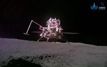 ![]() The Chang'e 6 lander (with the ascender on top) on the far side of the Moon. The photo was taken from Jinchan, a camera-equipped mini-rover that was released from the lander. | |