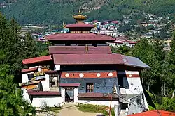 Changangkha Lhakhang is a compact temple complex located on the tip of a ridge that juts towards central Thimphu from the hills to the east. Founded in the 13th or 14th centuries, it is probably the oldest surviving temple in Thimphu. The main components and foundations of the monastery are extremely old, long predating the unification of Bhutan in the 17th century by Zhabdrung Ngawang Namgyal.[1] The temple is often frequented by parents with small children seeking to obtain blessings from the protective deity of the temple, Genyen Domtsangpa, who is considered to be the birth deity and protector of children born in JDWNRH national referral hospital in Thimphu.[2]