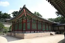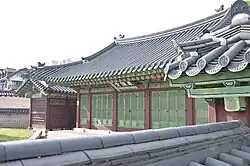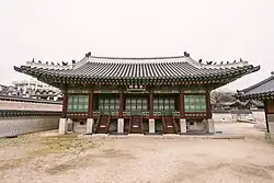 A single-story hall where the king received council and conducted politics.[92] It is a designated Treasure.[82] Spirit tablets were also possibly stored here.[92] It was built in 1405 and originally named Jogyecheong (조계청; 朝啓廳; Chogyech'ŏng). It received its current name in 1461. After being destroyed in 1592 during the Imjin War, it was rebuilt in 1608. It was destroyed in 1623 during the Injo coup and rebuilt in 1647, using materials recycled from a building called Gwangjeongjeon in In'gyŏnggung. It has since become the oldest extant building in the palace.[93] It is the only remaining Joseon palace building with blue roof tiles, which were then considered luxurious and difficult to make.[94][95] During the colonial period, the building was opened to the public, and glass put in its windows. The building was restored to its pre-colonial appearance in 1996.[95] |
