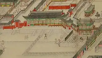 For the rest of his reign, Taejong primarily resided in Changdeokgung.[15] Gyeongbokgung's restoration was ordered only after Taejong had moved into Changdeokgung.[7] Even after his abdication, he resided in the palace Suganggung (수강궁; 壽康宮; later became Changgyeonggung) next to Changdeokgung; from there he influenced the reign of his son Sejong the Great (r. 1418–1450).[9] Even after Taejong's abdication, construction continued. Part of a building collapsed and the supervisor of that building's construction was exiled as punishment. By 1418, facilities were deemed adequate enough to hold more significant ceremonies at Changdeokgung instead of at Gyeongbokgung.[8] From the third year of Sejong's reign, Sejong began putting more emphasis on Gyeongbokgung and moved frequently between the two palaces.[16][5] In 1426, he ordered that many structures in Changdeokgung be named.[16] In 1427, he entirely moved out of Changdeokgung and resided primarily in Gyeongbokgung, although he continued moving between the two frequently.[16][5] King Sejo (r. 1455–1468) significantly expanded Changdeokgung to the north and east. For one such project, 19,000 people from the Hanyang region were assembled. King Seongjo (r. 1469–1495) also expanded the palace and resided in Changdeokgung for the entirety of his reign. In 1475, he had all 29 of the palace's gates named and held a ceremony for the installation of their name plaques.[17] As there was not enough space in Changdeokgung for all the living queens in the royal family, he decided to expand Changgyeonggung for them instead.[3] King Yeonsangun (r. 1495–1506) also greatly renovated the palace, although renovations were put to a halt when he was deposed.[18]