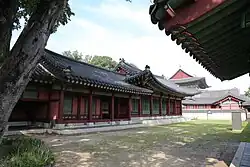 The government offices inside palaces are called kwŏllaegaksa (궐내각사; 闕內各司; gwollaegaksa). Changdeokgung's facilities were relatively small and meant for daily work with the king; most large government ministry facilities were located outside the palace,[96][58] for example on Yukcho Street.[96] After being destroyed in 1592 during the Imjin War, government offices were rebuilt in 1647.[22] Many offices that had once existed in Gyeongbokgung were moved over to Changdeokgung.[58] All government office buildings in front of Seonjeongjeon and Huijeongdang were demolished between 1907 and 1909.[41]
