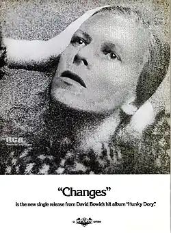 "Changes" is a song by the English musician David Bowie from his 1971 album Hunky Dory. RCA Records then released it as a single from the album on 7 January 1972. Written following his promotional tour of America in early 1971, "Changes" was recorded at Trident Studios in London in July that year. Co-produced by Bowie and Ken Scott, it featured Rick Wakeman on piano and the musicians who would later become known as the Spiders from Mars—Mick Ronson, Trevor Bolder and Mick Woodmansey.