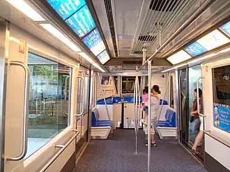 All Crystal Mover vehicles have four wide-opening doors, two on each side. The interior features longitudinal seating at both ends of the car for a total of 8 seats, with a spacious standing area in the middle of the car for baggage and trolleys. At the ends of every car, an equipment housing offers a flat platform for additional seating. Trains were also fitted with two LED text displays located near the ceiling which display travel information, and two media screens displaying Airport promotional material.[7]