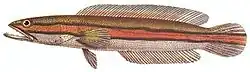 Channa micropeltes, giant snakehead, giant mudfish or toman harimau, is among the largest species in the family Channidae, capable of growing to 1.3 m (4.3 ft) in length and a weight of 20 kg (44 lb).[3] It is native to the fresh waters of Southeast Asia (South Indian populations are now regarded as a separate species, C. diplogramma),[3][4] but has also been introduced elsewhere and is considered invasive in Taiwan. Other names include shol machh (শোল মাছ ) in Bengali, red snakehead, redline snakehead, and ikan toman (where ikan is fish in Malay and Indonesian).