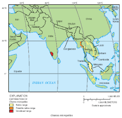 C. micropeltes is found in Southeast Asia, Malay Peninsula, and Indonesia .[3] It used to be believed to have an oddly disjunctive distribution, inhabiting both Southeast Asia and southwest India and Bangladesh, about 2,500 km (1,600 mi) apart. The Indian population was speculated to be from an early human introduction, prior to the 19th century.[6][7] In 2011, the Southeast Asian and Indian populations were found to be separate species, with the latter correctly named C. diplogramma (leaving C. micropeltes for the Southeast Asian population).[3][4]