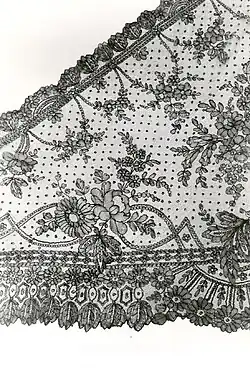 Chantilly lace is known for its fine ground, outlined pattern,[1] and abundant detail.[3] The pattern is outlined in cordonnet, a flat untwisted strand.[4][5][7] The best Chantilly laces were made of silk, and were generally black,[8] which made them suitable for mourning wear. White Chantilly lace was also made, both in linen and silk,[8] though most Chantilly laces were made of silk.[3] The black silk Chantilly lace became especially popular,[3] and there was a large market for it in Spain and the Americas. Chantilly and the Spanish laces (such as blonde lace) were the most popular black laces. Little white Chantilly was ever made.[6] Another notable thing about Chantilly lace is the use of a half-and-whole stitch as a fill to achieve the effect of light and shadow in the pattern,[3][6] which was generally of flowers. The background, or réseau, was in the form of a six pointed star,[5] and was made of the same thread as the pattern, unlike the otherwise similar blonde lace.[7] The lace was produced in strips approximately four inches wide, and then joined with a stitch that left no visible seam.[3][4]