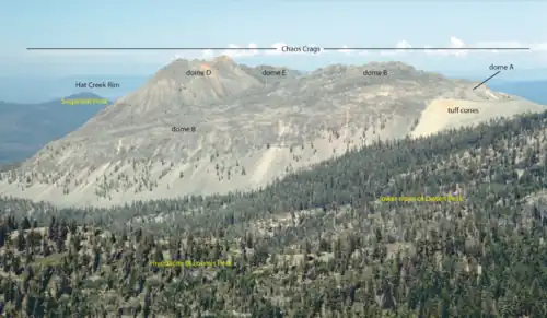 The Eagle Peak Sequence, which includes the Chaos Crags, consists of seven dacite and rhyodacite lava domes and lava flows, along with pyroclastic rock deposits.[11] The Chaos Crags consist of five small lava domes, made of rhyodacite,[14] which line up with the western edge of the Mount Tehama caldera.[15] The youngest part of the Lassen volcanic center's dome field[16] and the youngest domes in the Eagle Peak sequence,[14] they reach an elevation of about 1,800 feet (550 m) above their surroundings.[16] They lack a summit crater.[17]