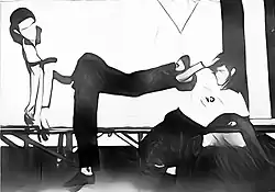 The double mule kick is a dangerous attack movement that can be used when escaping under armada, queixada, or meia-lua-de-compasso.[3] To perform the double mule kick, the capoeirista should evade the attack and get near the attacker by doing a "half" rolê. Then, the capoeirista should forcefully kick the attacker under the chin with both feet.[10]
