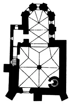 The chapel was most likely constructed before 1326, when it was part of the castle complex.[4] In the 14th century, it was a single-storey building with a crypt. It possessed a nave, as well as a polygonal presbytery, which was contained within the circumference of the castle's defensive walls. In 1407, the chapel was rebuilt in the gothic style by order of King Ladislaus II Jagiello (Jogaila of Lithuania). After increasing the height of the walls, the chapel became a two-storey structure, maintaining the old crypt. The form of the church was dominated by two steep step-patterned gables which survived until the 1650s. The lowest level of the building was designated as a crypt for deceased chaplains and local administrators, while the upper levels were used for religious services. The polygonal presbytery as well as the square nave were rib-vaulted. The vaulting of the nave was supported by a centrally-planned pillar. This structural element was typical for the sacral and secular architecture during the reign of Casimir III the Great. During the Renaissance, the church maintained a gothic character, however the entrance was positioned on the first floor (that is, one floor above ground-level) and was framed by a new Renaissance portal, made in the Komasków masonry workshop. It wasn't until the 17th century that the façade of the chapel was crested with a gable and attic in the style of the Lublin Renaissance. During the parliamentary sessions in 1569 regarding the Union of Lublin, a holy mass was held at the Holy Trinity Chapel, asking for successful deliberations.[4] Some of participants left inscriptions on the walls of the chapel commemorating the event.[4]