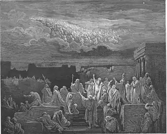 The letter then continues an extended analogy going backward in time tying Judas's Temple to figures in the Jewish past. The priest Nehemiah (5th century BCE) is said to have found a special liquid used to kindle the altar's holy fire called nephthar or nephthai (perhaps related to naphtha or petroleum).[14] The liquid was then poured into rocks. The story continues with how the prophet Jeremiah (6th–7th century BCE) hid both the liquid and various other Temple appurtenances for Nehemiah to find later. It also includes a brief story that King Solomon (10th century BCE) prayed for fire from heaven in a manner similar to Moses, which consumed a sacrifice. He then proceeded to celebrate for eight days. The letter writes that Nehemiah also established a library of writings and books, and that Judas has followed his example and done likewise, compiling a library of Jewish histories. The story of Nehemiah pouring the mysterious liquid into the rocks is possibly related to 10:3 which states that after purifying the Temple, Judas "ignited rocks and extracted fire from them".[15] This would establish a direct link between the altar of Nehemiah and Judas's temple. The theological intent is to tie Judas's cleansed temple to the original First Temple and establish it as equally legitimate. The altar fire came from heaven to Solomon; Jeremiah hid the Temple items and the fire as a way of ensuring the survival of the Temple for the future in a way beyond the reach of foreign rule during the Babylonian exile; Nehemiah rediscovered it; and now Judas had reignited this same fire reaching all the way back to heaven.[13]