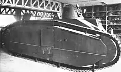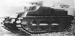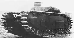 Development of the Char B1 ter was started at the same time as production funds were given for the bis with the intention of providing a tank armoured to 75mm.[6] A design with sloped and welded 70 mm armour, weighing 36.6 tonnes and powered by a 350 hp (260 kW) engine was meant to replace the B1 bis to accelerate mass production, a change first intended for the summer of 1940 and later postponed to March 1941. In the course of the redesign, space was provided for a fifth crew member, a "mechanic".[6] Cost was reduced by omitting the complex Neader transmission and giving the hull gun a traverse of five degrees to each side instead. The first prototype was shown in 1937.[6] Only three prototypes could be partly finished before the defeat of France. In May 1940 it was agreed to deliver nine Char B1s each month to Britain in exchange for a monthly British production of the "H 39". The three prototypes were lost after having been evacuated on 17 June 1940, their ship the Mécanicien Principal Carvin being bombed by the Germans in the Gironde on 21 June.[7] However, some believe that another prototype was obtained by Italy.