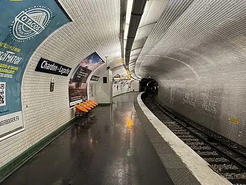 Chardon Lagache (French pronunciation: [ʃaʁdɔ̃ laɡaʃ]) is a station on the Paris Métro in the 16th arrondissement, serving line 10 (eastbound only). It is named after the nearby rue Chardon Lagache, which was named after a local retirement home. It is one of the few métro stations to have been named after a woman, after Bagneux–Lucie Aubrac, Barbara, Barbès–Rochechouart, Boucicaut, Louise Michel, Madeleine, and Pierre et Marie Curie.