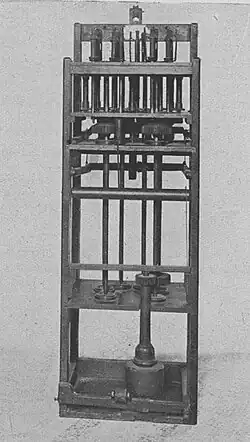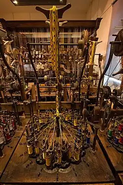 It wasn't until the start of the Industrial Revolution that Richard, and thus Europe, produced lace looms, developing a patent by the Englishman Thomas Walford in 1748, albeit with incomplete indications.[93] In 1750, probably inspired by the English patent, a braiding loom was developed in Germany by Bockmühl, at Barmen in the Wupper valley.[94] After further refinements, the shuttle stops when a thread breaks; this loom is driven by hydraulic power.[95][96] However, the efficiency of this type of machine was inadequate due to its design.[97] In 1783, François-Michel Perrault imported an iron model to France from Elberfeld -about 5 km from Barmen- still in the Duchy of Berg. Then his son, Jean-Éléonor, submitted an improved wooden model to Jean-François de Tolozan's office, for which he obtained a privilege in 1784.[98][Note 25][Note 26] This is most likely the loom that attracted Charles-François Richard's attention. On the one hand, the characteristics of the loom observed at the Musée des arts et métiers and those built by Jean-Éléonor Perrault make the builder also its inventor. On the other hand, the similarity of the prices with those later charged to Richard-Chambovet for loom construction makes the same. However, the Richard family never specifies this link. A known enmity had developed between the family and Perrault fils.[99] In 1942, this loom is still referenced in the latest series of Conservatoire catalogs, which testifies to its importance.[100] Thus Charles-François Richard "created a hitherto unknown industry by importing the mechanically operated spindle loom and gradually increasing its tooling and manufacture".[101]