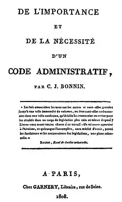 Bonnin, Charles-Jean Baptiste (4 October 1772 in France – October 1846) Progressive French thinker, theorist, and framer of the modern discipline of Public Administration.[1] From Bonnin's written work a great political and intellectual activity is clear. His academic works credit him as a forerunner of public, constitutional and administrative law. Actually, his 'Social Doctrine' situates him amongst the initiators of the science later known as Sociology. He also practiced parliamentary review and was interested in educational problems. Auguste Comte described Bonnin as a "mature and energetic man, a person with a spontaneous deep kinship for positivism and in whom we can find the true spirit of the Revolution".[2]