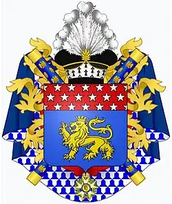 Augereau became Duke of Castiglione on 19 March 1808, a hereditary victory title (i.e. not in chief of an actual fief, but a hollow title), in honour of the 1796 victory. In 1809, he married the 19-year-old Adélaïde Josephine Bourlon de Chavange (1789 – 1869) whom he had become infatuated with.[14] Adélaïde, the daughter of Gilles Bernard Bourlon de Chavange and wife Jeanne Françoise Launuy, had no children with Augereau and the ducal title became extinct upon his death. His wife later remarried Camille de Sainte-Aldegonde (1787 – 1853), by whom she had a daughter Valentine de Sainte-Aldegonde (1820 – 1891), who married the 3rd Duke of Dino.