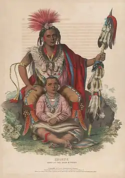 One of King's most renowned pieces in the project, Young Omahaw, War Eagle, Little Missouri, and Pawnees, focused on different Native American subjects. The artwork has been described as a "profound study of Indian character," a magnificent image of a "newly discovered and exotic race," and is composed of a "felicitous amalgam of the real and the ideal."[11] Some art historians, however, have taken a more critical approach to King's representation of Native Americans in this work. The portrayal of the Native American men in the painting is, according to this more critical view, merely a stereotypical conglomerate of different Native American tribes. King has seemingly "sacrificed their individuality, creating a facial composite that he hoped would draw a sympathetic response from a white audience."[12] King, these scholars suggest, structured his piece around the interests of his audience rather than portraying a true account of Native American tribes.