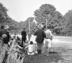 In 1900, funds were solicited from faculty, students, alumni and Ann Arbor businessmen to send Dvorak, three other Michigan track athletes, and Coach Fitzpatrick to the 1900 Summer Olympics in Paris.[16] In Paris, Dvorak missed the event finals following a controversy over the scheduling of certain event finals for a Sunday. Several American athletes agreed they would not violate Sabbath. The pole vault, in which Dvorak was a favorite, was one of the events scheduled for Sunday.[17] Two of the Americans (Dvorak and Bascom Johnson) nevertheless went to the Racing Club grounds where the event was to be held. They were told not to worry, that the event had been rescheduled.[18] The officials later changed their decision, and the event was held after Dvorak and Johnson had left.[17] Irving Baxter won the competition with a jump of 10 feet, 10 inches.[19] Because of the confusion, a special, albeit unofficial, competition was arranged for the athletes who had not participated in the Sunday event. Dvorak took the silver medal in the special competition with a jump of 11 feet, 1-3/4 inches.[19][20][21]