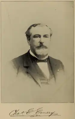 Charles Edward Emery was born in Aurora, New York, on March 29, 1838, the son of Moses Little and Minerva (Prentiss) Emery, and a direct descendant of one of the original proprietors of the plantation of Contoocook, Massachusetts.[1] He was educated at the academy in Canandaigua, New York, and early developed a taste for engineering. In July 1861, he entered the United States Navy as third assistant engineer, and served on the Richmond during engagements at Pensacola, Florida, the Mississippi River passes, and finally under David Farragut. In December 1862, he was promoted to second assistant engineer, and participated in the blockading of Charleston, South Carolina. In December 1867, he resigned, entered the employ of the Novelty Iron Works in New York City, and was general superintendent of the first American Institute Fair in its permanent quarters.