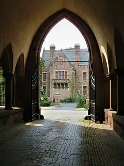 In 1927, cemetery administrators opened a Tudor-style office building, followed by a columbarium in 1939. Built with separate chapel and crematorium sections and a bell tower, the columbarium facility is situated on the cemetery's east side near Perry Street. Designed in the Romanesque Italianate style, the artistry and craftsmanship of its windows and bronze door continue to be a subject of attention by photographers even today.[16] On July 31, 1939, the Reading Times reported on this facility's opening as follows:[17]