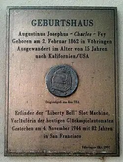 Charles Fey (born August Fey in Vöhringen, Kingdom of Bavaria; September 9, 1862 [1] – November 10, 1944) was a San Francisco mechanic best known for inventing the slot machine.