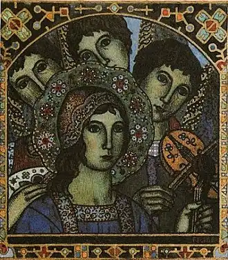 André Breton who bought several of Filiger's works considered him to be a surrealist, not strictly within the Pont-Aven school. Nor did Émile Bernard see him as a disciple of Gauguin, characterizing him as a mixture of Byzantine and Breton popular art forms. In Pont-Aven he remained a mystic and a recluse. The area provided fertile ground for his mystical imagery. Indeed, his geometric approach and expressionless faces in subjects such as Virgin and Child (1892) show his interest in early Italian painting and the Italian tradition. His landscapes, for example Breton Shore, reflect Gauguin's abstract quality and simplification.[1] Jan Verkade, who met him in Le Pouldu commented: "He produced very little but I have seen some very beautiful gouaches of his; they are mainly religious paintings, reminiscent of Byzantine and primitive Italian works, but quite personal and quite modern."[2]