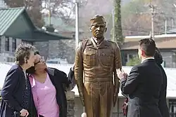 A bronze statue of him was unveiled at the Charles George VA Medical Center (CGVAMC) in Asheville on Sept. 24, 2016. “What a privilege is it to honor a true American hero in such a memorable way,” said Cynthia Breyfogle, CGVAMC director, said at the event. “I was both thrilled and humbled when I first heard that we would receive this statue. The legacy of Charles George was, and still is, an inspiration and influence beyond his local community. His courage and example join those of other brave men and women, past and present, who have answered the call when their country needed them.” The statue was sculpted by James Spratt, a U.S. Navy veteran, who died on the same day it was unveiled.[3]