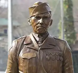 Pfc. George, a member of Company C, distinguished himself by conspicuous gallantry and outstanding courage above and beyond the call of duty in action against the enemy on the night of November 30, 1952. He was a member of a raiding party committed to engage the enemy and capture a prisoner for interrogation. Forging up the rugged slope of the key terrain feature, the group was subjected to intense mortar and machine gun fire and suffered several casualties. Throughout the advance, he fought valiantly and, upon reaching the crest of the hill, leaped into the trenches and closed with the enemy in hand-to-hand combat. When friendly troops were ordered to move back upon completion of the assignment, he and 2 comrades remained to cover the withdrawal. While in the process of leaving the trenches a hostile soldier hurled a grenade into their midst. Pfc. George shouted a warning to 1 comrade, pushed the other soldier out of danger, and, with full knowledge of the consequences, unhesitatingly threw himself upon the grenade, absorbing the full blast of the explosion. Although seriously wounded in this display of valor, he refrained from any outcry which would divulge the position of his companions. The 2 soldiers evacuated him to the forward aid station and shortly thereafter he succumbed to his wound. Pfc. George's indomitable courage, consummate devotion to duty, and willing self-sacrifice reflect the highest credit upon himself and uphold the finest traditions of the military service.[7]