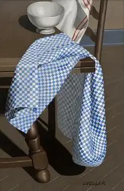 After his return to the United States Goeller joined the young American artists associated with the Daniel Gallery located on Madison Avenue in New York. In March 1929 the gallery included his work in an exhibition that also included paintings by Peter Blume, Preston Dickinson, Elsie Driggs, Karl Knaths, and Yasuo Kuniyoshi.[8][note 2] Reviewing the show, critics called attention to a still life of his called "Checkered Tablecloth." One remarked on the high quality of the work and pointed out that the cloth "drapes itself cunningly,"[13] another noted his "meticulous technique" and "vibrating color,"[14] and a third saw in it a tendency toward Neues Sachlichkeit.[2][note 3][note 4]