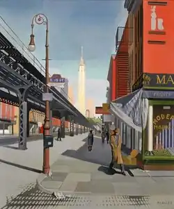 Having achieved critical recognition for his still lifes in the early 1930s, Goeller painted a larger number of landscapes during the middle and late years of the decade.[4][25] After joining the Public Works of Art Project, he painted the highly regarded "Third Avenue" in 1934.[29] In a style that was identified as precisionist, this painting used geometric forms and flat planes to emphasize "the scale and power of modern technology," according to a biographer,[4] Following his employment in the Public Works of Art Project, Goeller joined the Federal Art Project.[30] Subsequently, a mural of his won a cash prize in a 1935 competition and was exhibited at the Architectural League.[31]