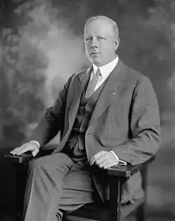 MacDowell was a member of the committee on chemicals of the Council of National Defense.[2] He served as director of the chemical division of the War Industries Board from 1917 to 1918.[3] During the war, he helped develop the first commercially producing potash plant that used alunite as a raw ingredient. He also improved the chamber process of the manufacturing of sulfuric acid and the use of vanadium-alumina as a substitute for platinum in contact acid plants.[5] He was an economic advisor for President Woodrow Wilson's Paris Peace Conference.[3][6] During the peace talks, he lived with Alexander Legge in Paris and they worked closely together. He was Legge's alternate for the committee on Germany.[7] In 1923, he was chairman of the trade and industry group of the U.S. delegation during the International Chamber of Commerce Meeting in Rome.[3] In January 1929, as a member of the senate interstate commerce committee, he opposed a bill to stabilize the bituminous coal industry.[8] In 1944, he was elected chairman of the 5th district Republican campaign committee.[6]