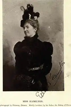Ethel Mary Hamilton was born and educated in Quebec. She accompanied her parents on her father's election to the bishopric of the Ottawa, Ontario diocese in 1896. On May Day, 1898, at Government House, Ethel Mary Hamilton was elected and crowned "May Queen". She presided over the May Court Club, which had been established by the Earl and Countess of Aberdeen from 1896 until 1900.[5]