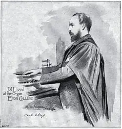 Lloyd was invited to fill the position of music teacher at Eton College from 1892, when Sir Joseph Barnby resigned. As Instructor of Music, his work was largely that of supervision with six music teachers under him. He played the organ in the Eton College Chapel every morning and afternoon, as well as on Sundays, and rehearsed the choir. He also gave frequent organ recitals on Sunday evenings.[3] One of his pupils at Eton was Frederick Septimus Kelly, whose musical inclinations were greatly inspired by him.[12]