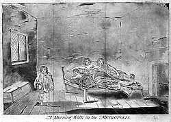 Wild gives an example of the marshal's treatment of well-dressed women too. Once he seized a baillif's wife in the street in Ludgate Hill for talking to a man and accused her of being "lewd". He took her to Cheapside and made her wait till he dined and paid for his meal.[33][34] Pickpockets, or "mathematicians" as Hitchen called them affectionately", appear with a noteworthy incident in this period. On their regular night walks near St Paul's, Hitchen and Wild saw the boys running away. Hitchen, having information on a stolen book, saw the reason of their hiding. He caught and arrested one, whose name was James Jones, the same juvenile who stole Lord Barnard's bills. The boy gave the address of his friends next morning before the justice and Hitchen took Wild to Barbican to attack their house during the night. The uninvited guests were welcomed with unfriendly 'damn ye', upon which the assistant Wild was left inside with the company while the marshal fled for bringing more constables. The gang of around 12-year-olds was taken and tried at Kingston assizes as their robbery was committed in Surrey. To the great disappointment and fury of the marshal, the court acquitted the boys upon their parents' complaint of the marshal forcing their children to commit crime. He could not claim the usual 40 pounds for their dead-or-alive heads. Moreover, he was reprimanded by the court for the base interest.[35][36]