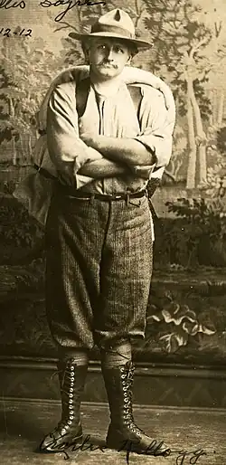 After discovering an 1867 treatise by John Tyndall that a small and regulated flame could be extinguished by a sound of the appropriate frequency, he claimed to have developed the technique to do this with his voice.[5] He was also a skilled craftsman and an inventor. In 1924 he designed and patented a mechanized fruit and nut picker.[9] He also designed a movable fireplace. Every time he visited his California home, he found that the forests were dwindling and along with his friends who included John Muir and John Burroughs he considered ways to highlight the loss. He "kept thinking and thinking through many years how to take the forest out to the world ...[since] the world could not come out to the forests". After World War I he saw a powerful truck, a Nash Quad and decided to modify it by adding a body made from a 7 metre section of a redwood and carving it out with a bed, a toilet and a kitchen with cupboards. The wood weighed 3 tons and could not be lifted. He then dug a tunnel under the wood and drove the Nash Quad under it and then had the log body lowered onto it. He called his vehicle the "Travel Log" and drove it around at a maximum speed of about 8 km/hour. In later years he traveled in a lighter vehicle that he called the "Bird Wing" - something that he claimed would start when he whistled to it.[5] He traveled at various times to the West Indies and Fiji where he observed a fire-walking ceremony. He also traveled to Paris where he met Auguste Rodin.[10]