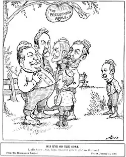 Bartholomew was born February 10, 1869, in Chariton, Iowa to Col. Orion A. and Mary Smith Bartholomew.[1] He attended the Iowa State College, graduating with a bachelor's in science, and meeting his future wife, Ella Louise Henderson. He began working as a reporter for the Minneapolis Journal before becoming one of the first daily editorial cartoonists in the world in the late 1890s. From 1899 to 1915, he produced an editorial cartoon almost every day, usually published on the front page. His cartoons were reproduced in newspapers around the world, as well as the American and European Review of Reviews. The subject of his cartoons ran the gamut from the Spanish–American War to local Minnesota politics and weather. During his time at the Journal, he also drew a number of Saturday cartoon strips, and worked as a children's book illustrator.