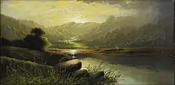 Leslie exhibited at the Royal Academy (5 works), the British Institution (3 works), the Suffolk Street Gallery of the Society of British Artists (16 works), and exhibited in many lesser-known Victorian art venues as well.[3] He died of liver disease at the age of 46 on 9 September 1886 at Mitcham Road Tooting near Wandsworth, Surrey.[1] British museums with examples of his work include the National Library of Wales, the Royal Holloway Museum at the University of London and the Victoria Museum and Gallery in Liverpool. One of his landscapes is also on view at the Museum Geelvinck Hinlopen Huis[4] in Amsterdam in the Netherlands.
