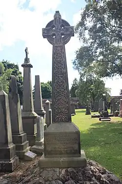 He was interred very close to his home at the Grange Cemetery.[5] His monument is a large Celtic cross facing the north path.
