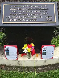 McMahon and Judge were members of the Marine Security Guard (MSG) Battalion at the US Embassy, Saigon and were providing security for the DAO Compound, adjacent to Tân Sơn Nhứt Airport, Saigon. McMahon had arrived in Saigon on 18 April, while Judge had arrived in early March.[3] Both died in a North Vietnamese rocket attack on Tân Sơn Nhứt on the morning of April 29, 1975.[4][5][6][7][8]