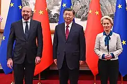 On 27 September 2020, Michel expressed deep concern over the escalation of hostilities in the disputed region of Nagorno-Karabakh and called on Armenia and Azerbaijan to immediately halt fighting and progress towards a peaceful resolution.[21] After French-U.S. and French-Australia relations suffered a period of tension in September 2021 due to fallout from the AUKUS defense pact between the U.S., the United Kingdom, and Australia. The security pact is directed at countering Chinese power in the Indo-Pacific region.[22] As part of the agreement, the U.S. agreed to provide nuclear-powered submarines to Australia. After entering into AUKUS, the Australian government canceled an agreement that it had made with France for the provision of French conventionally powered submarines.[22] The EU called the way France was treated "unacceptable" and demanded an explanation.[23][24][25] Michel denounced a "lack of transparency and loyalty" by the United States.[26]