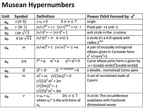 Muses also envisioned a mathematical number concept, Musean hypernumbers, that includes hypercomplex number algebras such as complex numbers and split-complex numbers as primitive types. He assigned them levels based on certain arithmetical properties they may possess. While many open questions remain, in particular about defining the relations of these levels, Muses pictured a wide range of applicability for this concept. Some of these are based on the properties of magic squares,[1] and even related to religious belief. He believed that these hypernumbers were central to issues of consciousness.