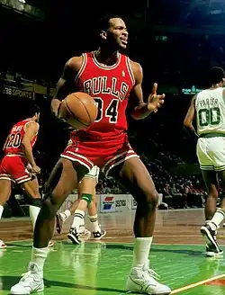 Oakley also assumed the role of the team "enforcer", whose duty primarily was to protect young Jordan against cheap shots and roughhousing tactics of opposing players. He was given the nickname, "Oak Tree", for his rugged demeanor and no-nonsense attitude.[6][7] On April 26, 1987, Oakley set a postseason career high with 25 points scored, alongside grabbing 15 rebounds, in a loss to the Boston Celtics.[8]