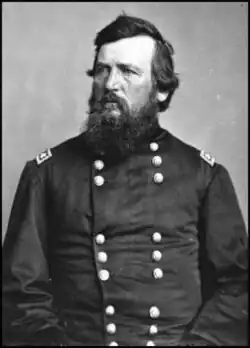 Woods fought with distinction at the Third Battle of Chattanooga in November 1863, and was made a brevet colonel in the Regular Army as of November 24 for his efforts there. He was promoted to the rank of brigadier general in the Union Army on August 4, and by January 1864 was given divisional command. He was promoted to major in the Regular Army in the 18th U.S. Infantry on April 20, 1864, and was appointed a brevet major general in the Union Army for his actions during the Battle of Griswoldville on November 22, the first engagement of Sherman's March to the Sea.[1] Woods was then appointed a regular brevet brigadier general and quickly then to brevet major general on March 13, 1865, both in the Regular Army.[8]