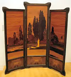 He worked with equal facility in many mediums; posters and books, glass, boxes and trays, wood paneling and, most significantly, inlaid furniture for interior decoration. He also worked in collaboration with others, such as Léon Elchinger (pottery) and Jean-Désiré Ringel d'Illzach (sculpture).[2]