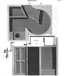 The book is dedicated to Strutt, and Sylvester is careful to assign many of the inventions to Strutt, and to note that the heating designs installed in the new infirmary had already been tried on Strutt and his friends' houses. Sylvester documented the new ways of heating hospitals that were included in the design, and the healthier features such as self-cleaning and air-refreshing toilets.[3] The toilets had a carefully designed door that would exchange the air for fresh as each user exited. The same door action also washed the basin.[3]