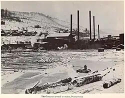 Goodyear gave up the practice of law in 1887 to form a lumber company with his brother, Frank H. Goodyear, under the firm name F. H. & C. W. Goodyear. They invested in timberlands, lumber mills, coal, and railroads in remote areas of Pennsylvania and New York.[4] They bought up large tracts of timberland that were considered inaccessible for harvest, because the lands were isolated and away from the streams that were typically used to transport logs. To access the timber, they built railroad spurs for transport, and local sawmills to process the trees into lumber. In many areas, they built company towns for workers in the isolated sawmills. They achieved great financial success with these strategies.[5]